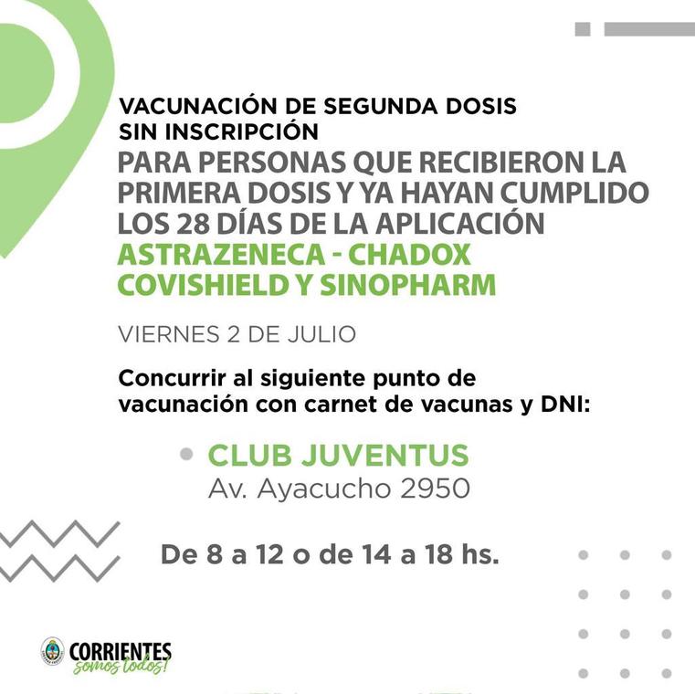 El Gobierno de Corrientes por medio de su Twitter oficial recuerda que este viernes 2 de julio se realizará la vacunación de segunda dosis sin inscripción para aquellas personas que hayan recibido la primera dosis de las vacunas Astrazeneca-Chadox, Covishield y Sinopharm y hayan cumplido los 28 días o más desde su primera aplicación.