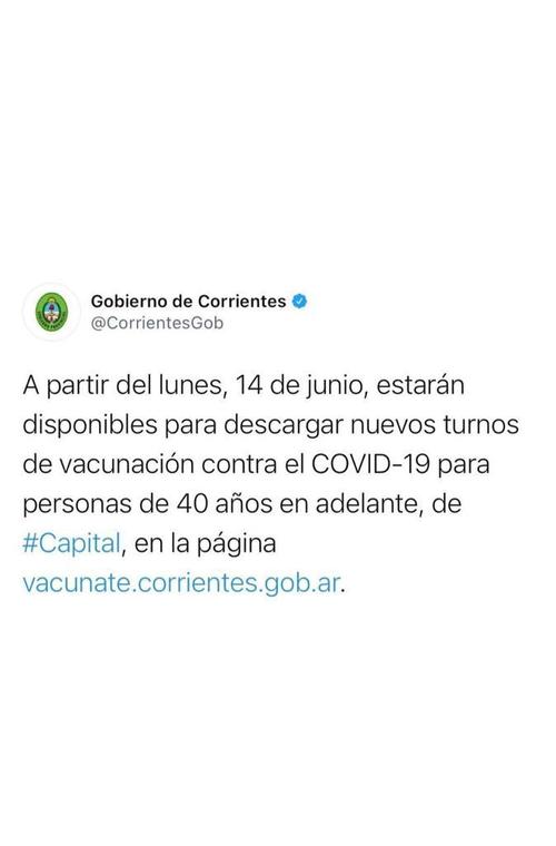 El gobierno de Corrientes informó a través de las redes sociales que a partir del lunes, 14 de junio, estarán disponibles para descargar nuevos turnos de vacunación contra el COVID-19 para personas de 40 años en adelante, de Capital, en la página vacunate.corrientes.gob.ar